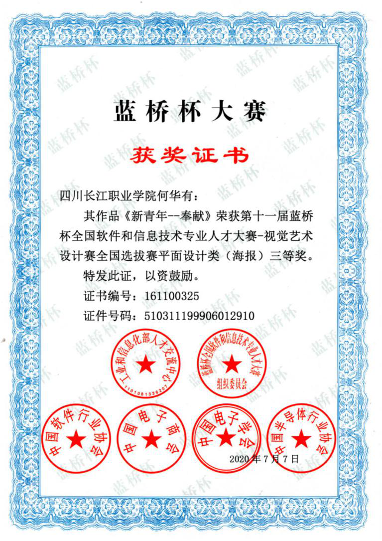 长江鼎利学院涂立利老师指导何华有、吴松阳两位同学完成的“新青年–奉献”、“新时代-掌上生活 ”作品,分别荣获第十一届蓝桥杯全国高校视觉艺术设计赛全国选拔赛平面设计类三等奖。