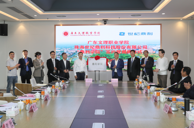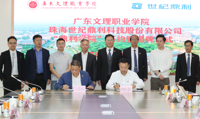 2021年12月1日下午,世纪鼎利与广东文理职业学院隆重举行签约暨揭牌仪式,珠海世纪鼎利科技股份有限公司董事长李涛、广东文理职业学院董事长宣承志共同为“鼎利学院”揭牌。