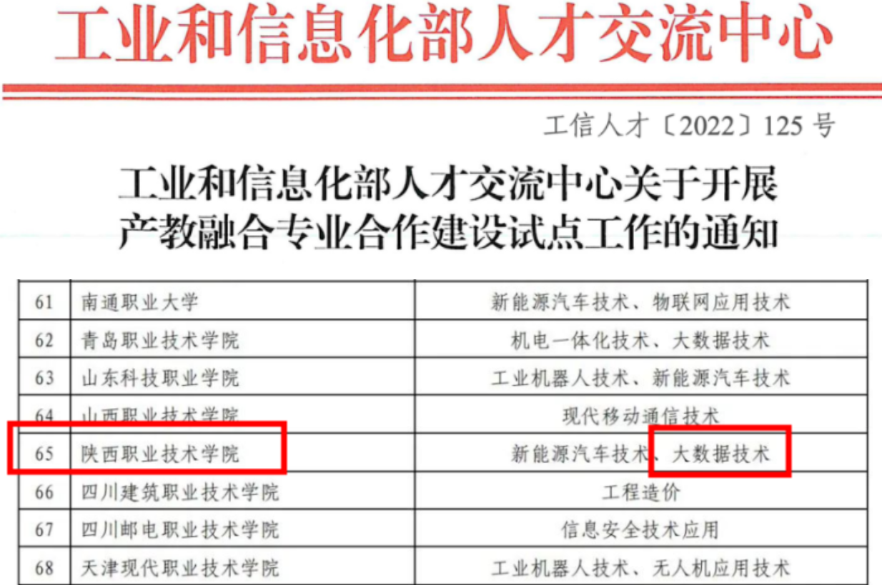 为贯彻落实《关于推动现代职业教育高质量发展的意见》,按照《工业和信息化部人才交流中心关于公开遴选产教融合型专业建设试点院校的通知》要求,经自主申报、专家评议等工作程序,公布了工业和信息化部人才交流中心第一批产教融合专业合作建设试点单位名单。其中,陕西职业技术学院与珠海世纪鼎利科技股份有限公司校企合作的大数据技术专业入选工信部首批产教融合专业合作建设试点专业。