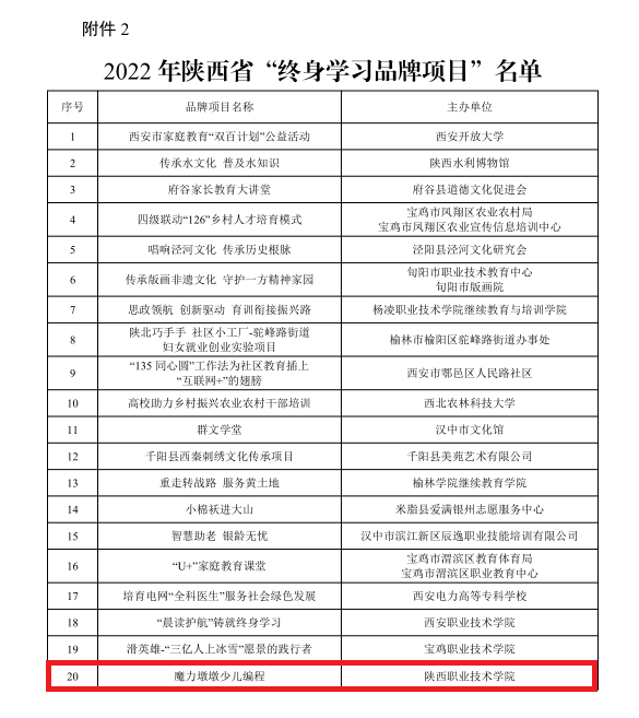 近日,陕西省教育厅公布了2022年“终身学习品牌项目”评选结果,我院电子信息工程学院申报的《魔力墩墩少儿编程》项目荣获“终身学习品牌项目”称号。
