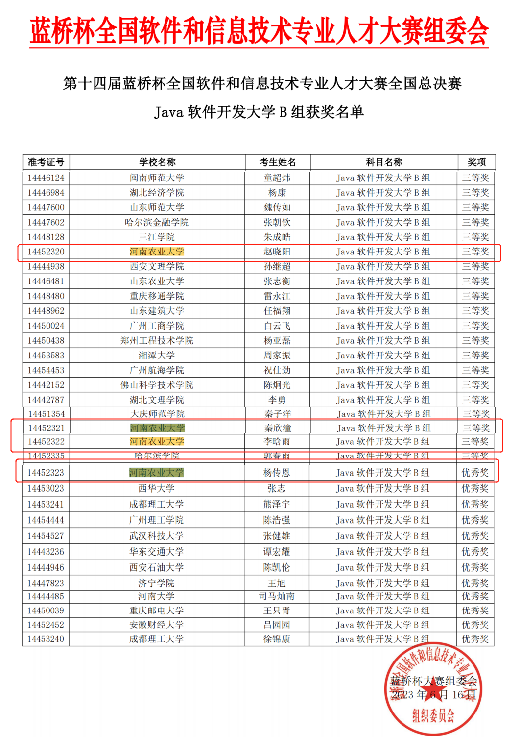 6月10日,第十四届“蓝桥杯”全国软件和信息技术专业人才大赛全国总决赛如期举行。河南农业大学鼎利学院学生赵晓阳、李晗雨、秦欣潼、杨传恩四位同学在本次国赛中成功晋级。经过激烈的角逐,最终取得了国家三等奖3项、优秀奖1项的优异成绩!